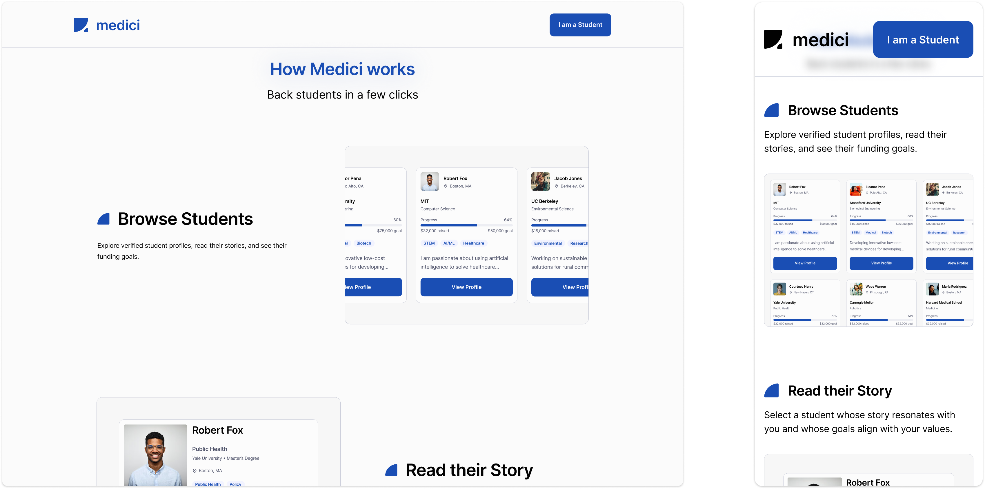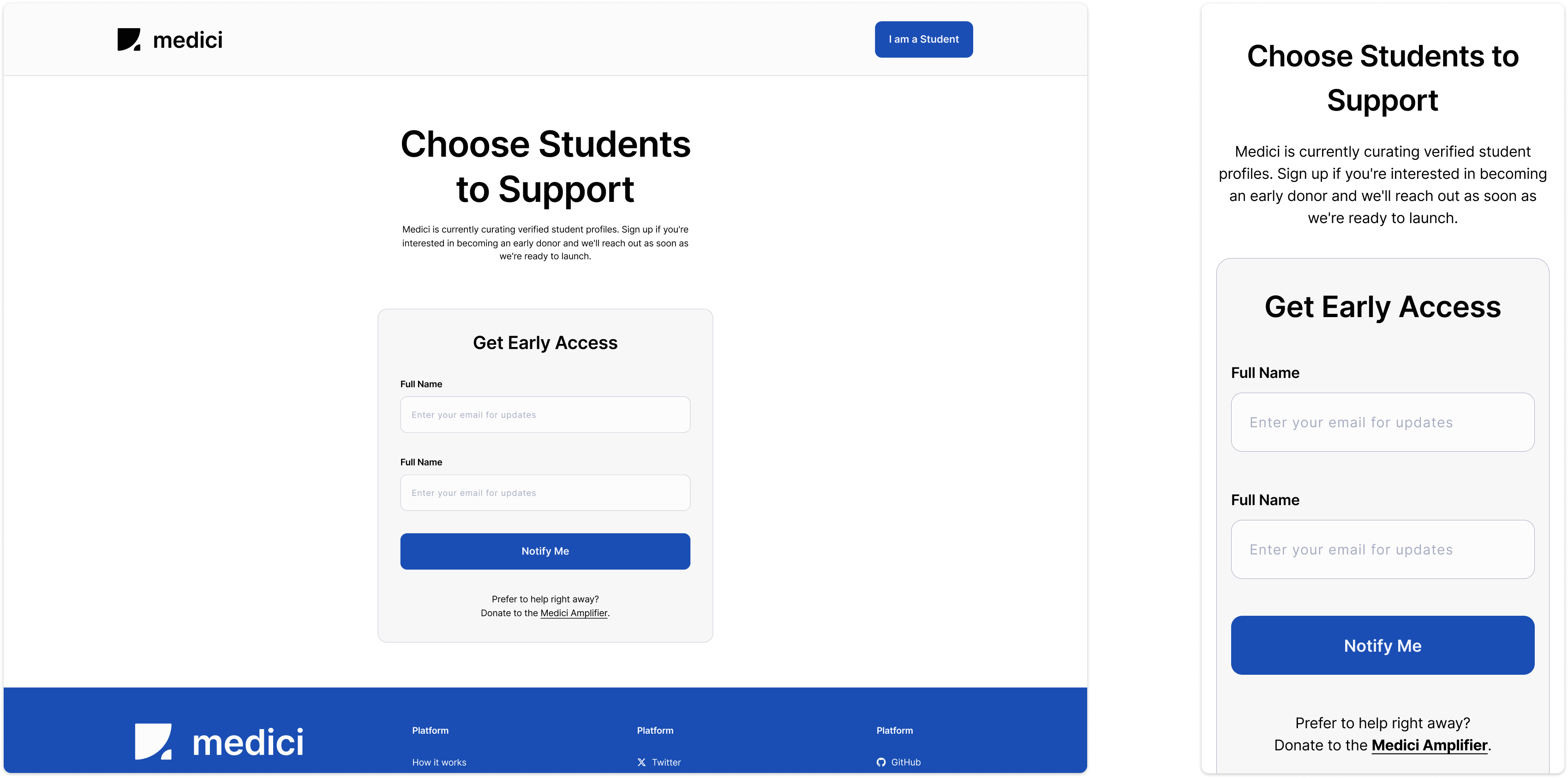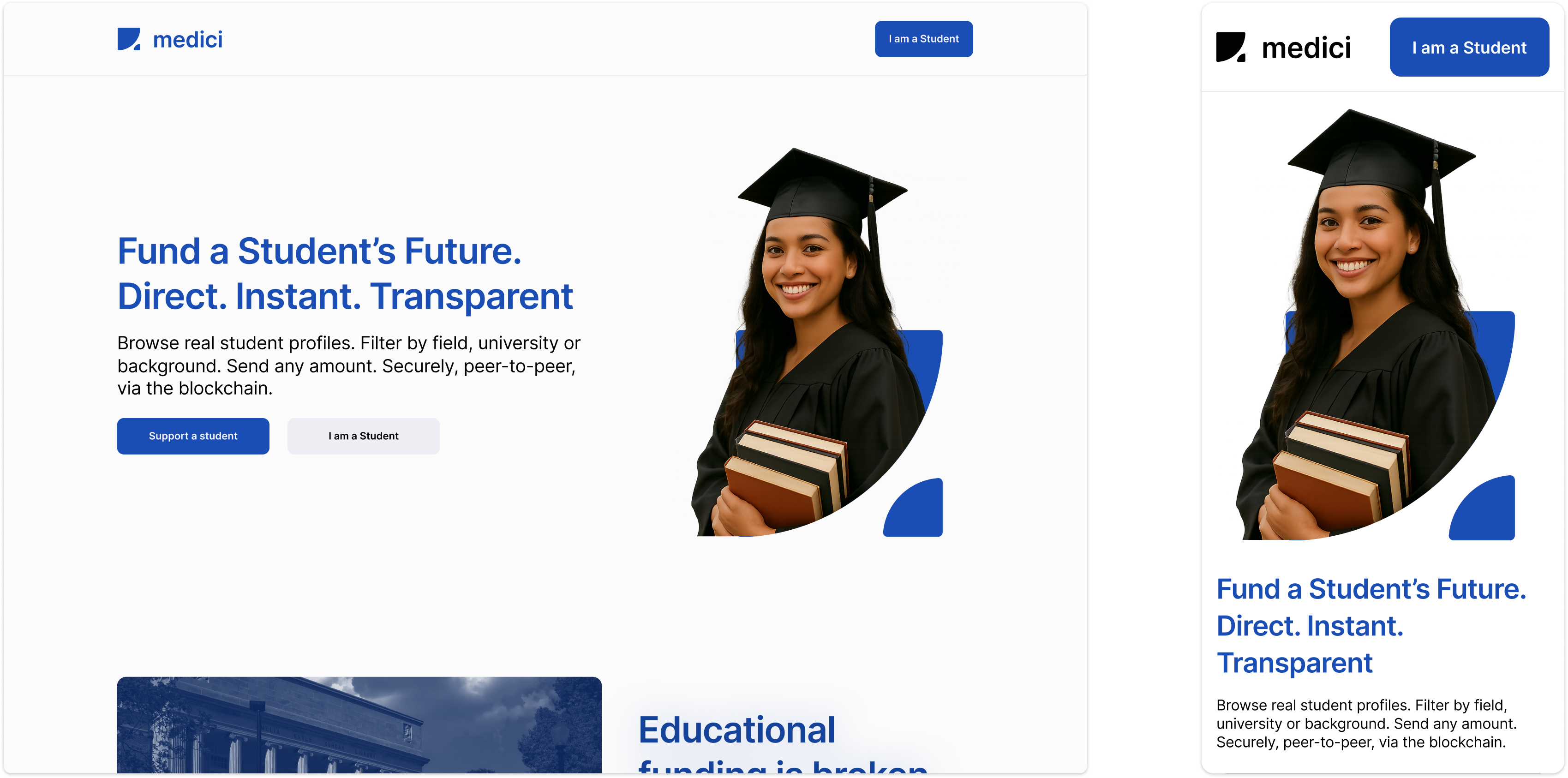 I designed the website for medici.ac, a platform that allows donors to contribute USDC directly to students attending American colleges, helping them cover their tuition fees. My work focused on crafting the visual identity and aesthetic of the platform, designing a clean and trustworthy interface, and creating the graphic assets that bring the project’s mission to life.
